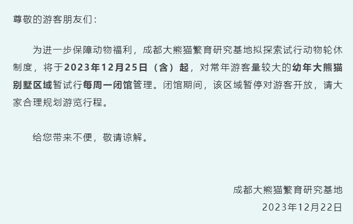 为进一步保障动物福利,成都大熊猫繁育研究基地拟探索试行动物轮休制度,将于2023年12月25日(含)起,对常年游客量较大的幼年大熊猫别墅区域暂试行每周一闭馆管理。闭馆期间,该区域暂停对游客开放,请大家合理规划游览行程。