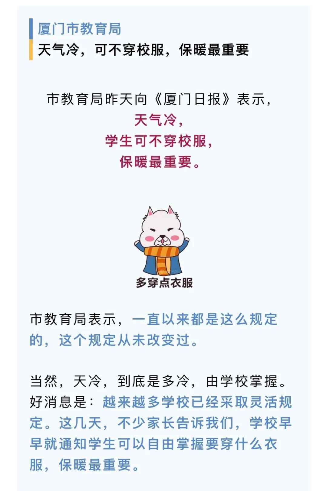 气温大跳水,校服还要强制穿吗?记者收到广州市教育局的回应,表示已经下发通知,各区各校在家校联系过程中应提醒学生做好防寒保暖,不强制要求学生统一穿校服返校。记者也注意到此前已有多地发布相关通知,浙江省宁波市多所学校表示学生可以不穿校服,注意保暖,福建省厦门市教育局也发布提醒,不要强制要求学生统一穿校服。