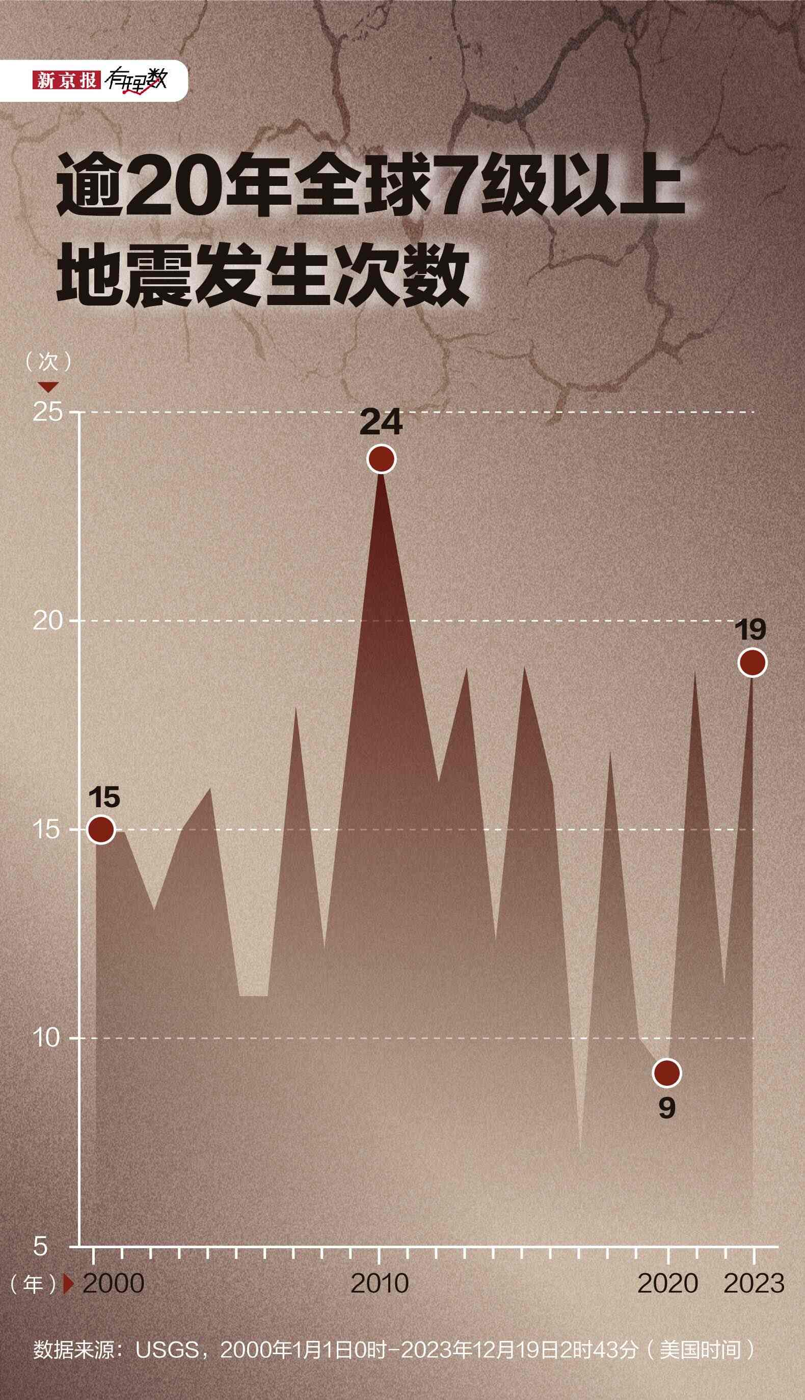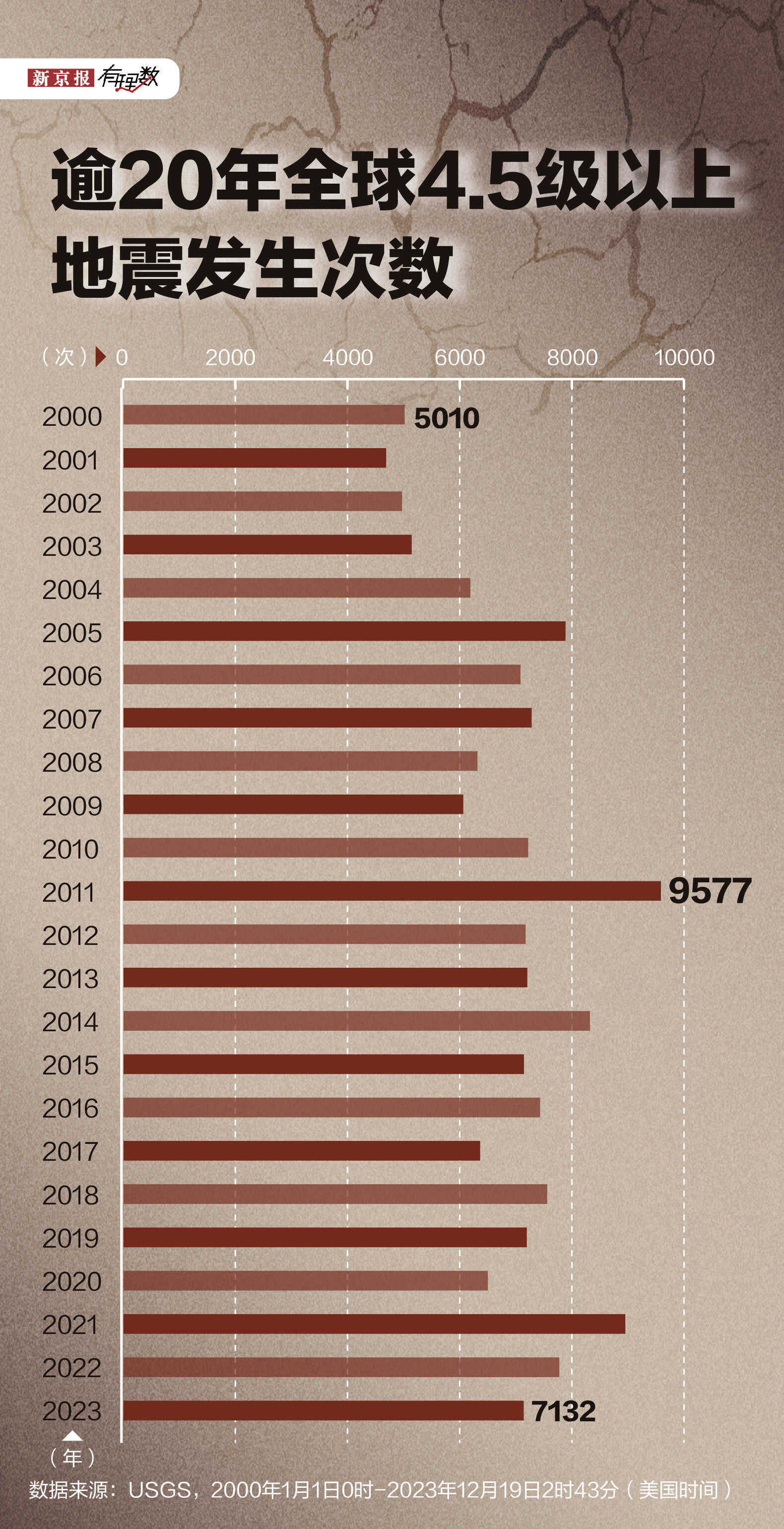 可以看到,2000年以来全球平均每年发生6900多次4.5级以上地震,也就是说全球范围内每天大概会有19次破坏性地震,我们的地球一直开启的都是震动模式,地壳一直都是运动的。2023年初到12月19日,已发生了7132次地震,对比其他年份并没有明显的提升。