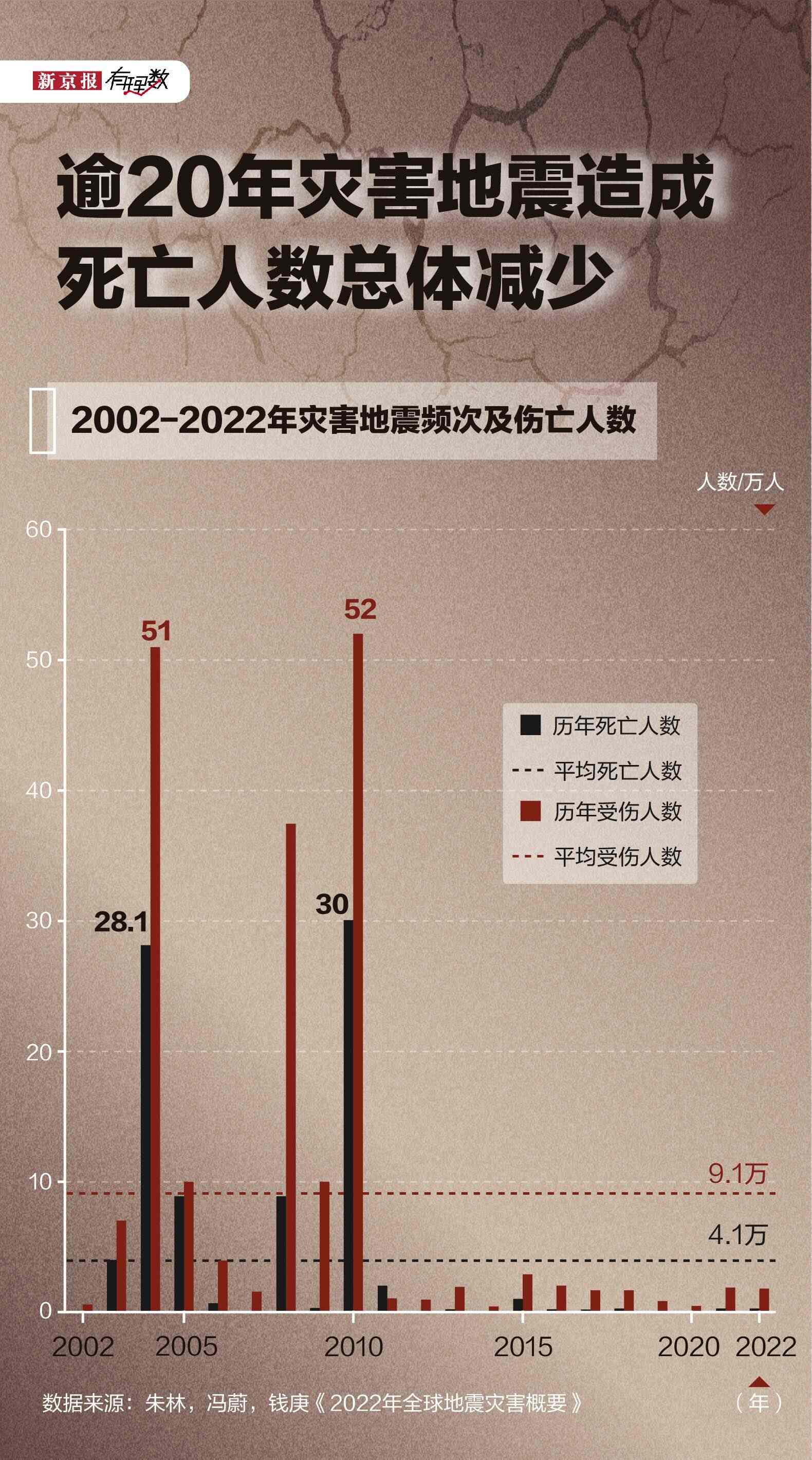 从全球范围来看,得益于救援力量进步以及预警技术提升,近些年来地震灾害造成的死亡人数总体呈现减弱趋势。将近10年与前10年数据进行对比,可以发现虽然地震的次数有所上升,但整体造成的伤亡人数却有所降低,这也表现出在全球范围内,整体的抗震能力有所提升。