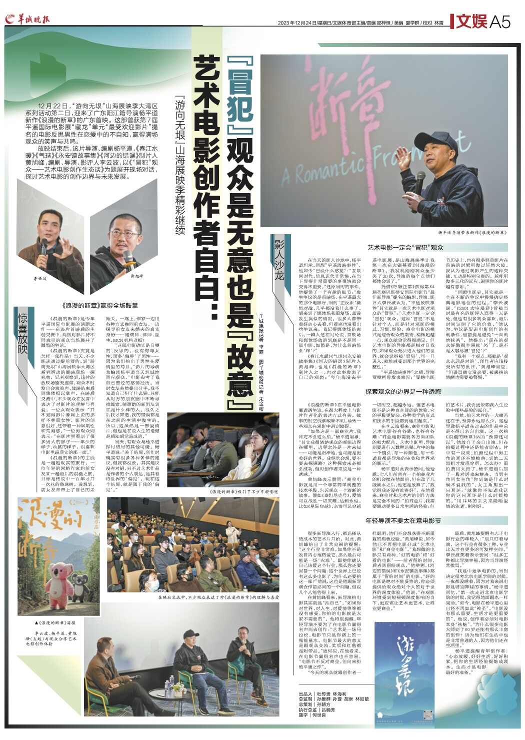 12月23日,“游向无垠”山海展映季大湾区系列活动第二日,迎来了广东阳江籍导演杨平道新作《浪漫的断章》的广东首映。这部曾获第7届平遥国际电影展“藏龙”单元“最受欢迎影片”提名的电影反思男性在恋爱中的不自知,赢得满场观众的笑声与共鸣。
