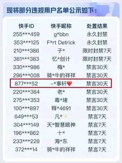 在平台公示的15个违规用户名单中,处罚最严重的2名用户被永久封禁,拥有300多万粉丝的女网红“董事轩”则被禁言30天。