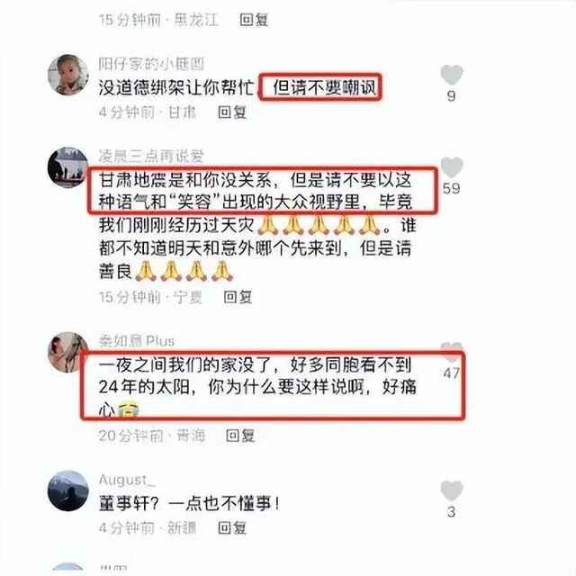 当时有网友在她的直播间提到“甘肃地震了”。“董事轩”在看到之后,竟笑着回应:“甘肃地震了,啊?甘肃地震离我800公里远,跟我有什么关系吗?”