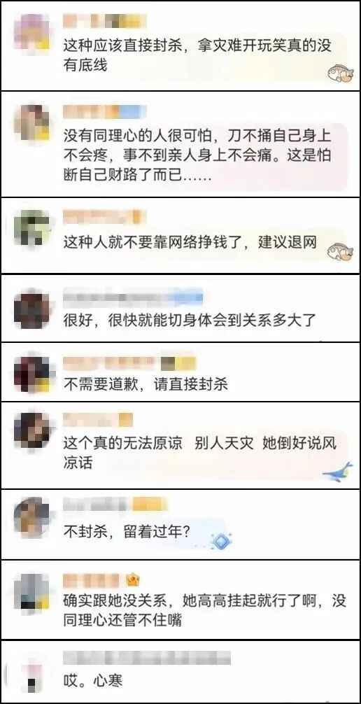 “董事轩”的这波操作引发众怒,随后社交账号被广大网友攻陷,不少网友在其评论区留言:“这种应该直接封杀,拿灾难开玩笑真的没有底线”“这个真的无法原谅,别人天灾,她倒好说风凉话”。