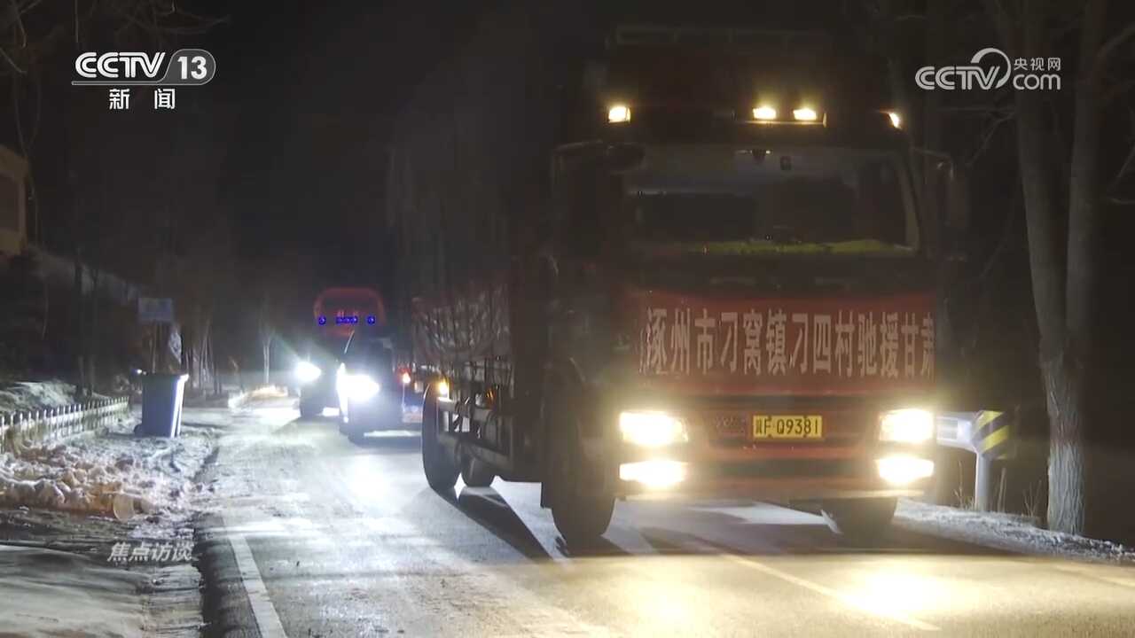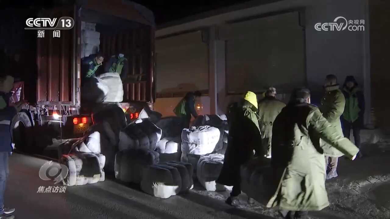 为了尽快给村民送去保障物资,刁四村村民的车队日夜兼程。22日凌晨,历经32个小时,带着全村2000多人的嘱托,这个车队跨越1600公里,终于抵达了积石山县的安集镇。顾不上休息,刁四村的村民就和当地村民一起把货物卸了下来。五车物资,足足卸了三个小时,其中包括2400件军大衣、2580件棉被、1820副自发热鞋垫。