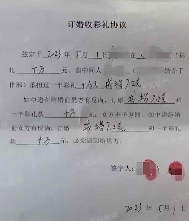 订婚当日,两位准新人的签字摁手印签订的订婚收彩礼协议显示,如结婚前男方反悔,订婚戒和10万元彩礼款女方不予返还;如结婚前女方有反悔,订婚戒和10万元彩礼必须返还男方。