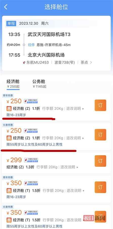 事实上,通过第三方旅游平台查询,首页同样显示299元,点击进入详情页面后,也可以购入青年和老年人的专属机票。