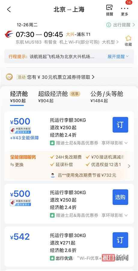 另外,也有少部分航班票价有细小差异。比如12月26日北京飞上海MU5183次航班,在12306平台的特惠机票为450元,且没有年龄和职业限制;在第三方旅游平台上,该航班票价则为500元。