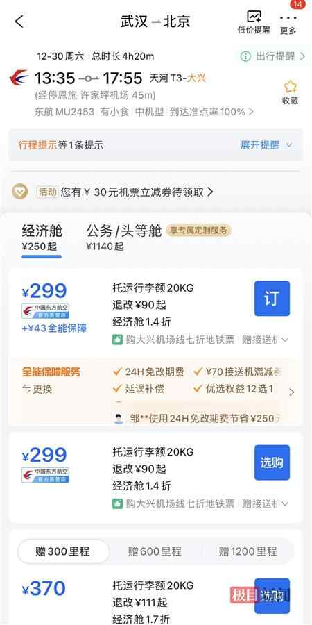以12月30日武汉飞北京为例,东航航班MU2453在12306平台显示裸票价格250元起,该航班在第三方购票平台显示裸票价格299元。