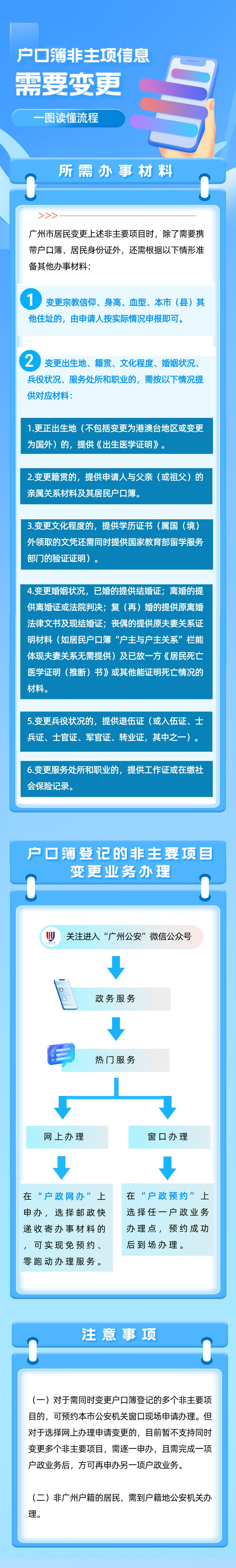 广州市居民变更上述非主要项目时,除了需要携带户口簿、居民身份证外,还需根据以下情形准备其他办事材料: