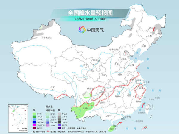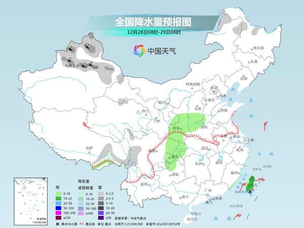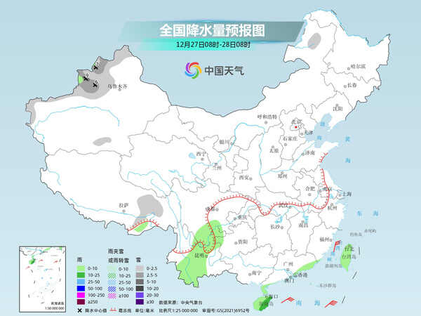 具体来看,今天,内蒙古东北部、黑龙江东部、吉林东部、新疆北部、四川南部等地部分地区有小到中雪或雨夹雪。四川南部、云南中西部、海南岛大部等地部分地区有小雨。