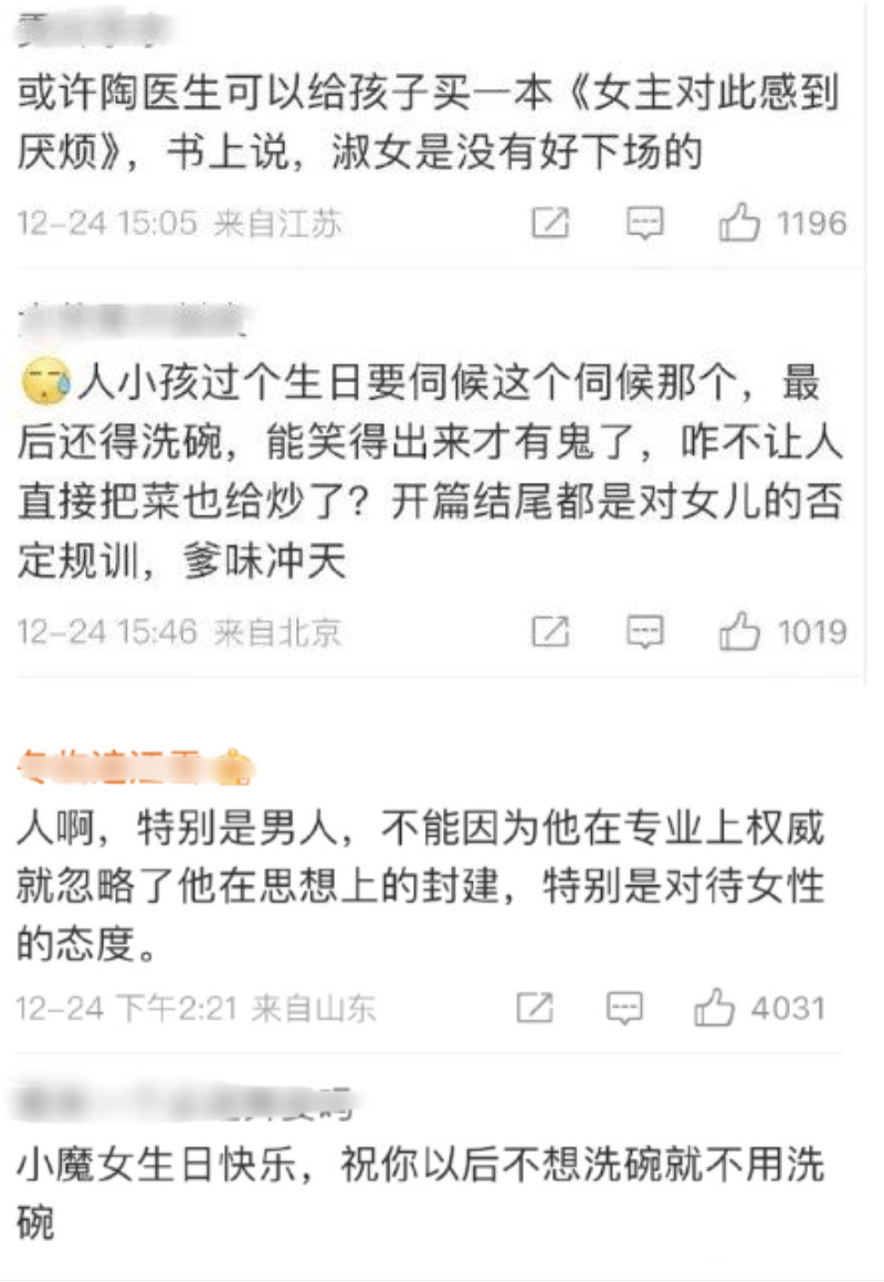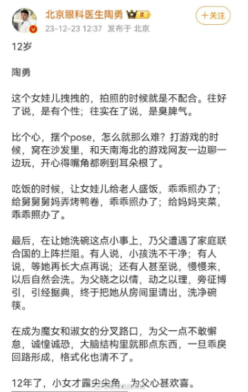 12月23日,陶勇医生因分享与女儿的相处日常而被网友骂“爹味十足”,陶勇医生随后删博。