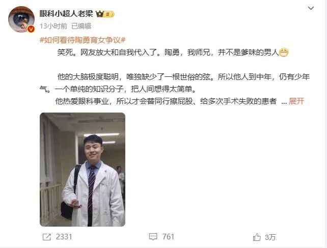 12月24日深夜,拥有超330万粉丝的医生大V“眼科小超人老梁”发长文力挺陶勇,称他是自己的师兄,并不是爹味的男人。文中提到: