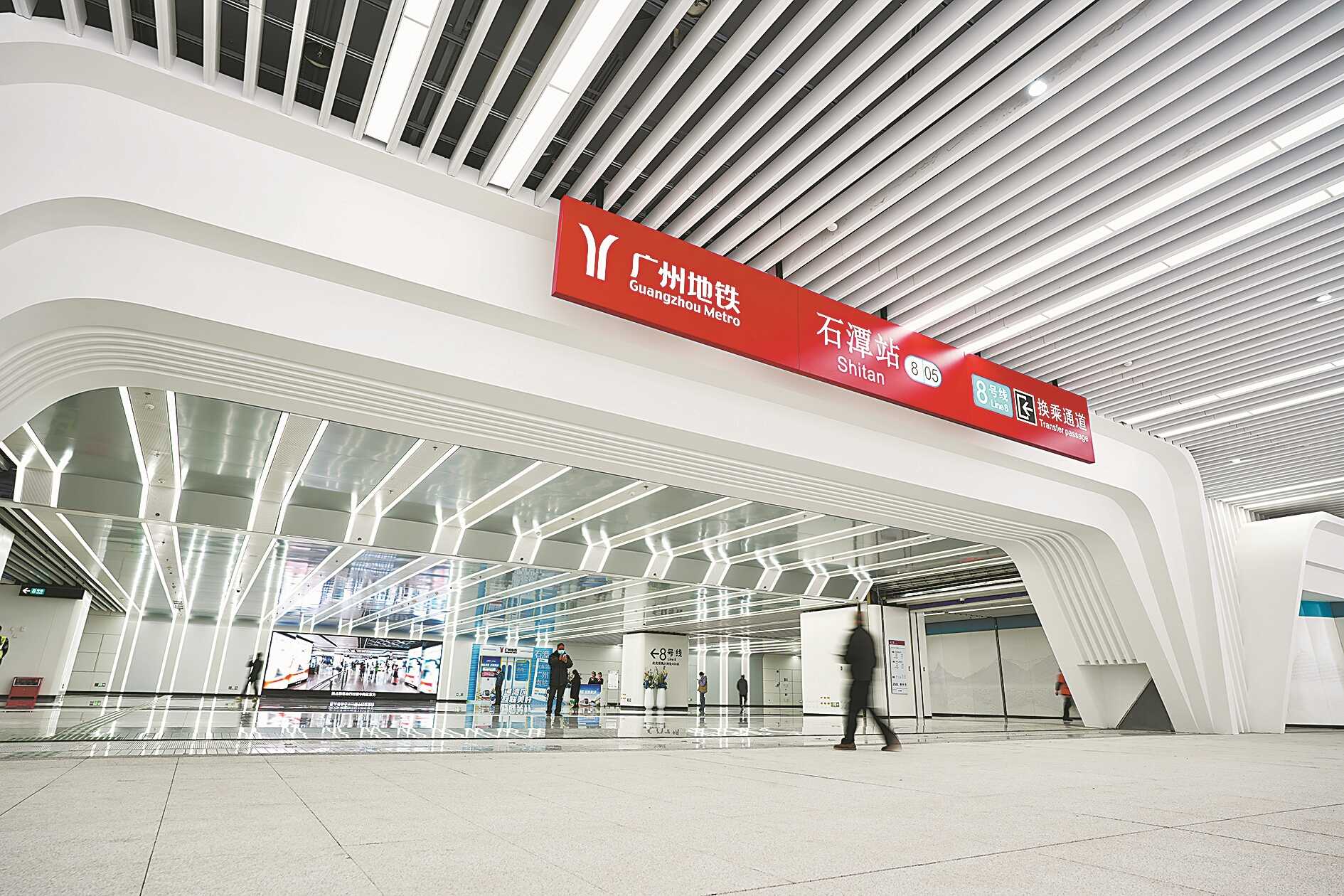 26日当天,八号线石潭站通往广州白云站的换乘通道(简称“石白换乘通道”)正式开通。该换乘通道全长450米,宽约15米,西接石潭站站厅和出入口通道,沿棠槎路(规划)道路下方布置,向北延伸至白云站站厅,设12台自动步道,最快可8分钟抵达白云站。