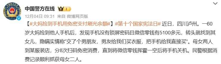 近日,话题“捡到手机用免密支付刷光余额”登上微博热搜榜,引起网友热议。