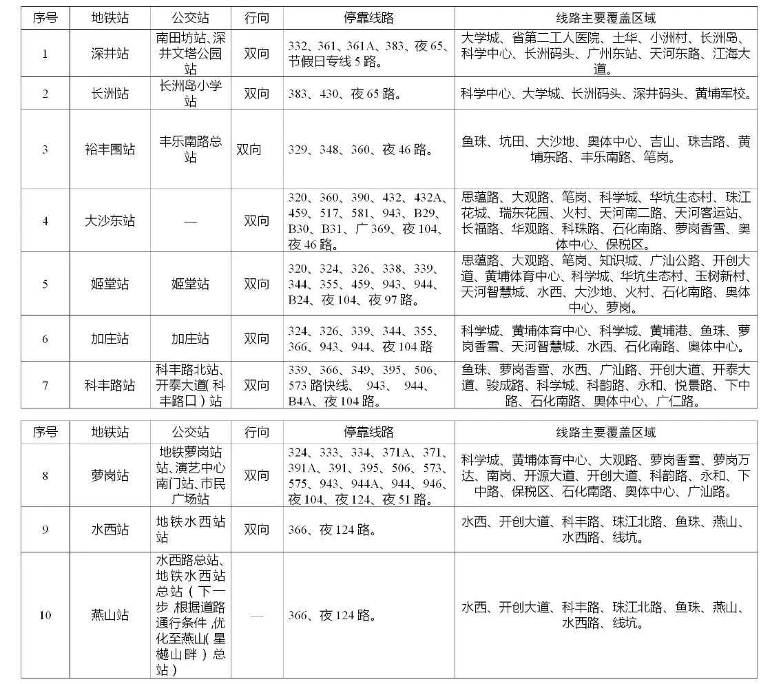 一是根据地铁站点同步配套调整优化接驳公交站点位置。广州市交通运输部门将地铁五号线东延段双沙站、保盈大道站、夏港站、黄埔新港站,七号线二期长洲站、裕丰围站、姬堂站、加庄站等地铁站点周边公交站点迁移至地铁站点出入口近旁,市民可实现地铁与公交的方便换乘,出行更加便利。