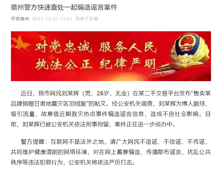 据平安宿州12月27日晚消息,近日,宿州市网民刘某辉(男,26岁,无业)在某二手交易平台发布“售卖某品牌捐赠甘肃地震灾区羽绒服”的帖文。经公安机关调查,刘某辉为博人眼球、吸引流量,故意借近期救灾热点事件编造谣言信息,造成不良社会影响。