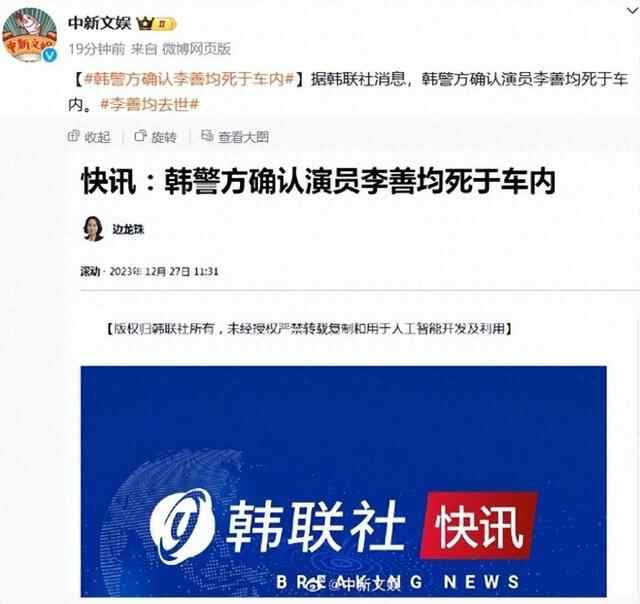 12月27日,据韩媒消息,韩警方确认演员李善均死于车内。