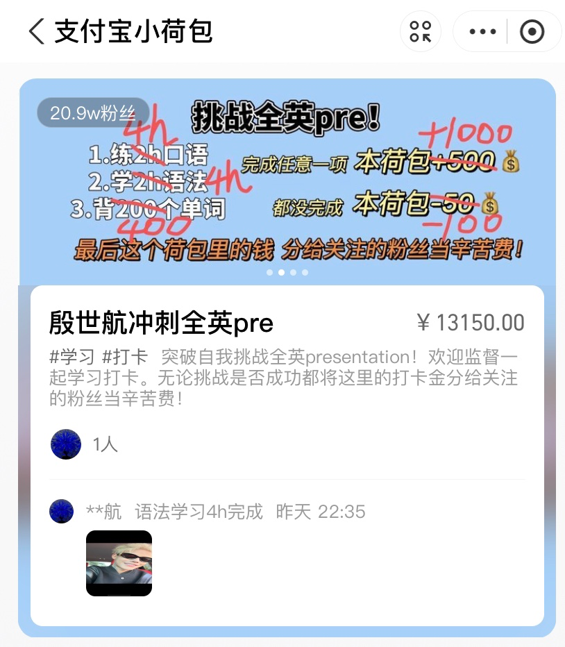 还有不少年轻人为计划中的旅行、看演出、学英语等坚持攒钱打卡、激励自己。数据显示,2023年,支付宝小荷包已诞生了超2000万个攒钱“小目标”。其中一个“突破自我挑战、冲刺全英文演讲”的学习打卡,吸引近20万人围观。