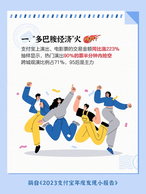 根据《2023支付宝年度发现小报告》,过去一年,年轻人为了热爱奔赴山海,推动支付宝上演出、音乐会门票交易金额涨223%;年轻人“上夜校”悄悄努力;00后“万事打卡”自我激励,每月超200万人上支付宝打卡;“小攒青年”花式攒钱,在支付宝攒出了2000万个小目标;113万小店用AI给自己打工,“商战”打进巷子里……