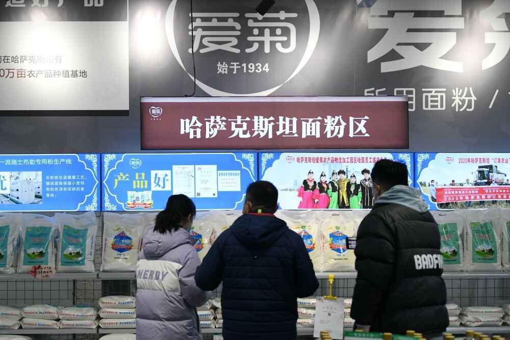 2023年1月13日,消费者在位于西安国际港务区的爱菊健康生活体验馆挑选哈萨克斯坦面粉产品。新华社记者 李一博 摄