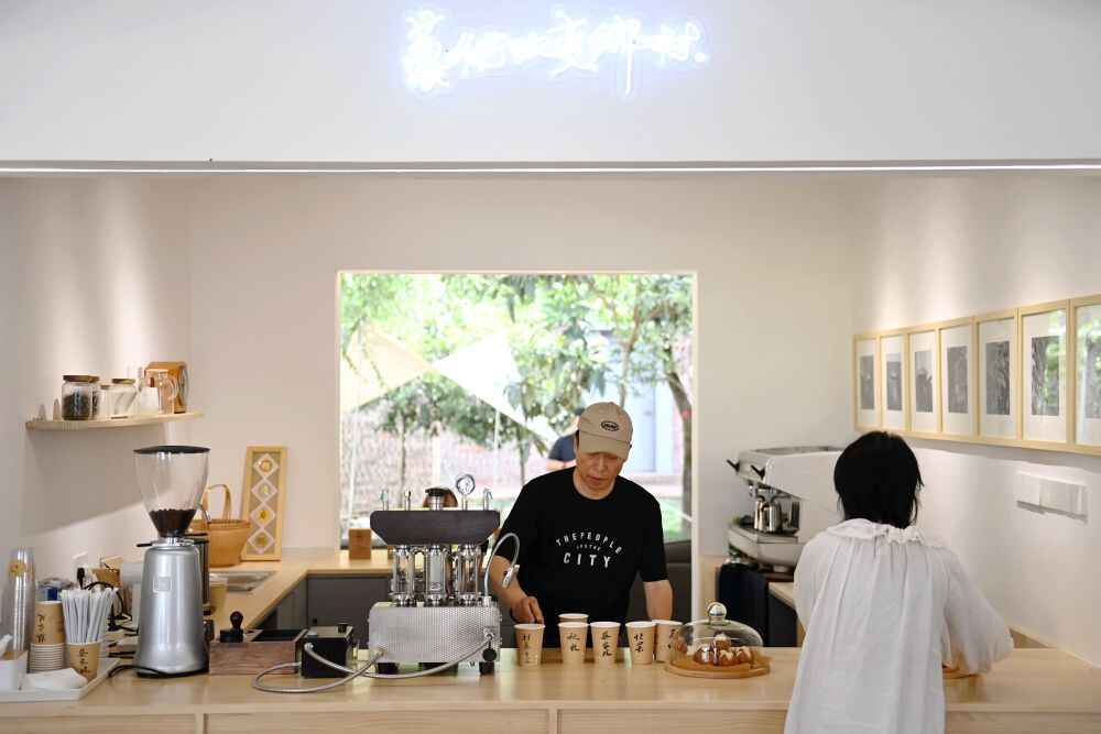 2022年7月5日,咖啡师沈洪义在陕西省西安市鄠邑区蔡家坡艺术村长之家为顾客制作咖啡。新华社记者 李一博 摄
