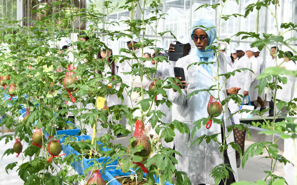 2023年11月14日,参加中非农业合作论坛的嘉宾在海南省三亚市吉阳区大茅村的农业科创中心参观。新华社记者 杨冠宇 摄