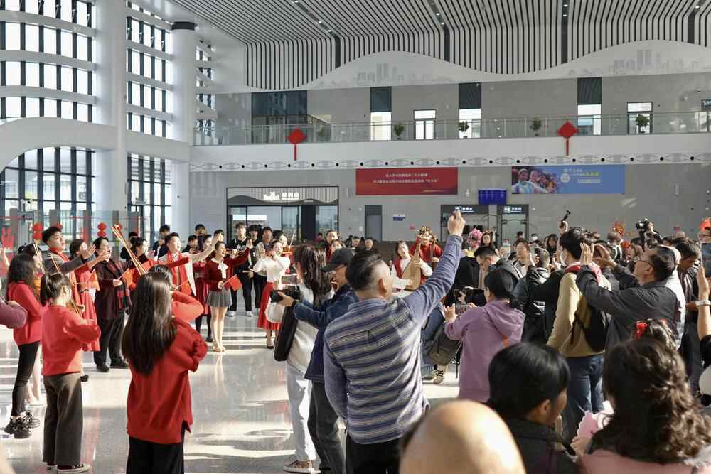 崭新的汕头南站候车大厅充溢着满满的“潮侨元素”和新年气息,侨批样式的展示牌介绍着潮汕非遗文化,鲜红的剪纸艺术作品和“中国结”等瞬间将新年氛围感“拉满”。