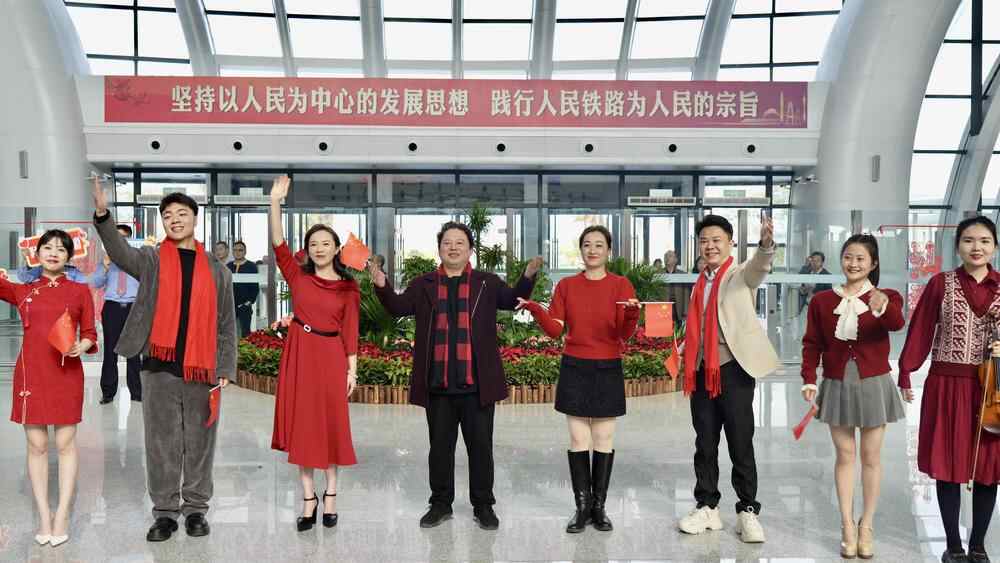 “快闪”活动开始后,由歌手和乐器演奏者组成的表演团队伴随着悠扬的旋律进入到候车大厅正中央,邀请现场候车旅客舞动五星红旗,共同演绎《我爱你,中国》,开启全场“大合唱”模式,赞美伟大的祖国和美丽的家乡,整个站厅充满了欢乐、喜悦的气氛。
