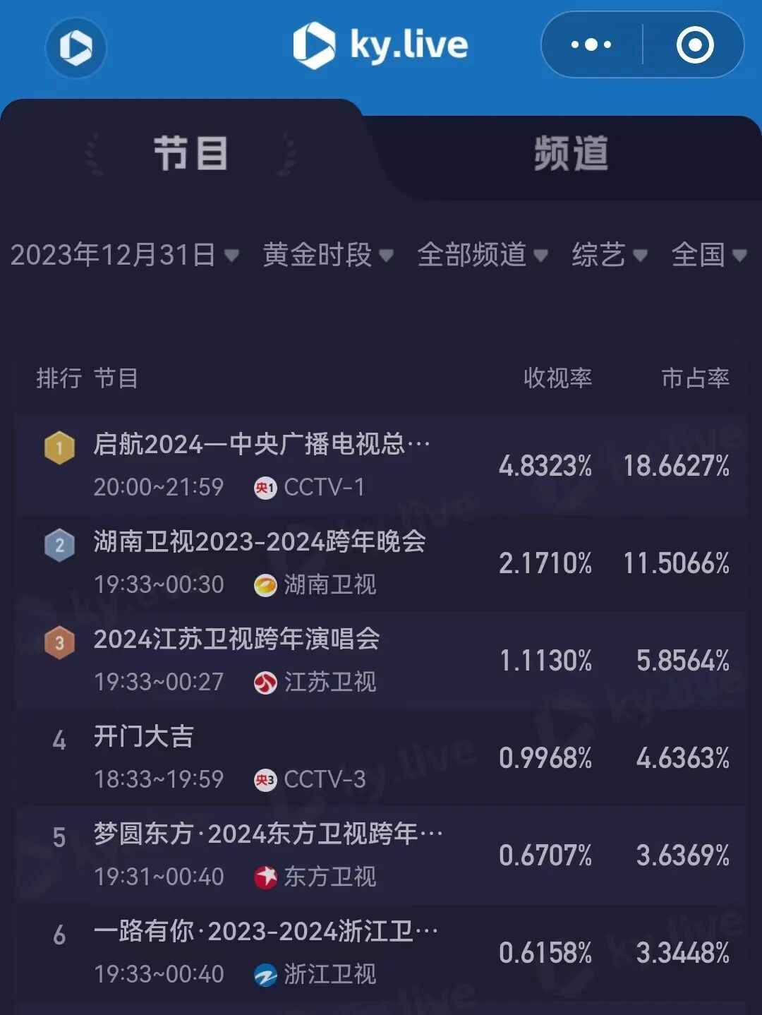 零点过后,收视率统计即时性最强的酷云数据出了结果。当晚,央视跨年晚会以4.83%的收视率拿下断层第一,湖南卫视跨年晚会以2.17%的收视率位居卫视第一,江苏卫视以1.11%拿下卫视第二,东方卫视以0.67%拿下卫视第三,浙江卫视以0.62%拿下卫视第四。