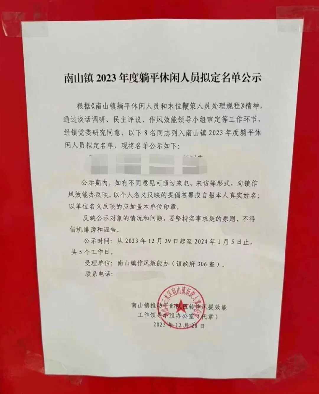 网传图片显示,南山镇作风效能办于2023年12月28日盖章公示《南山镇2023年度躺平休闲人员拟定名单》。该公示文章称,根据《南山镇躺平休闲人员和末位鞭策人员处理规程》精神,通过谈话调研、民主评议、作风效能领导小组审定等工作环节,经镇党委研究同意,有8名同志列入南山镇2023年度躺平休闲人员拟定名单。公示期内,如有不同意见可通过来电、来访等形式,向镇作风效能办反映。公示时间为2023年12月29日至2024年1月5日,共5个工作日。