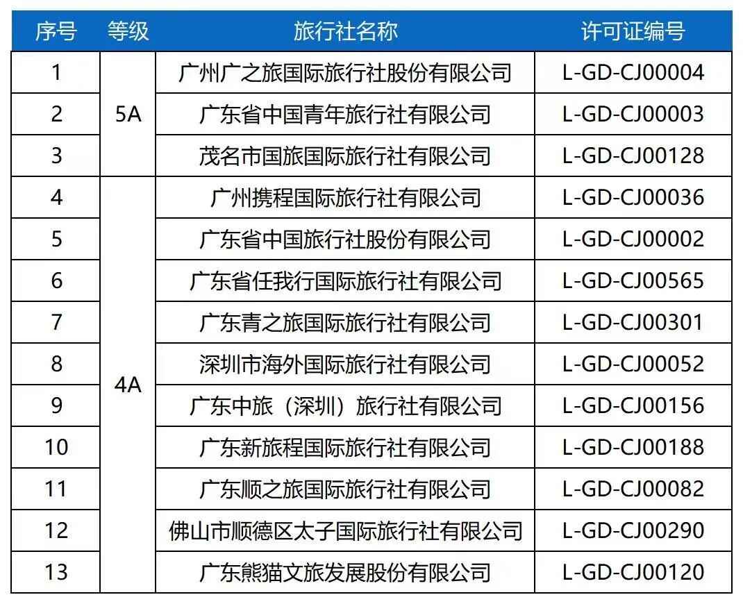 经各地级以上市推荐、资格初审、材料审核、专家评审、现场核查等,广州广之旅国际旅行社股份有限公司等3家旅行社拟评定为广东省5A级旅行社,广州携程国际旅行社有限公司等10家旅行社拟评定为广东省4A级旅行社,公示期至2024年1月7日。