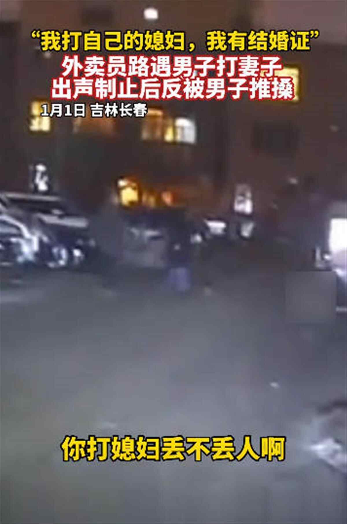 视频显示,1月1日下午5时40分许,在吉林长春某小区内,一名外卖小哥喊道,“大元旦的,打媳妇丢不丢人?”随后,一名男子朝外卖小哥走来,开始推搡外卖小哥,男子还说道:“我打我自个儿的媳妇,我有结婚证,你随便报警,我没动手。”后来,男子离开,外卖小哥打电话报警。