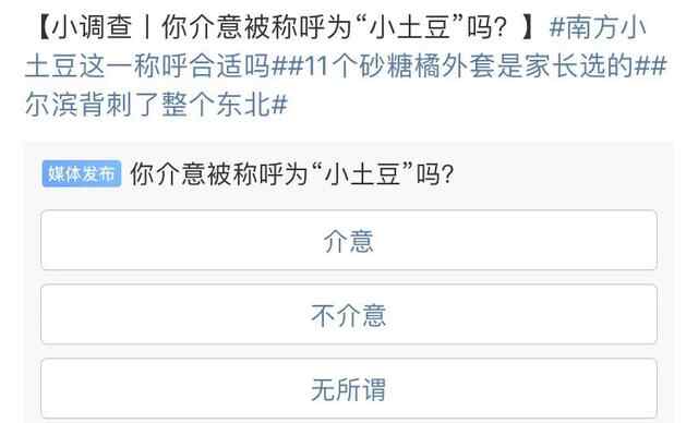 随后,多家媒体在微博发起“你怎么看南方小土豆这一称呼”投票。53%的网友投给了选项一“可可爱爱”,14%的网友投给选项二“非常反感”,12%的网友投给选项三“不太好听”,21%的网友投给选项四“我无所谓”。