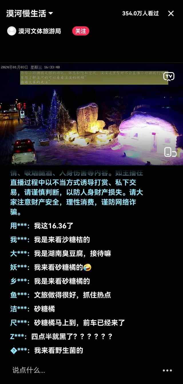 在漠河文旅局开启的漠河慢生活直播间,数据显示超340万人看过直播,“小砂糖橘呢”等评论刷屏评论区。“为给小砂糖橘足够的游玩、休息和隐私空间,漠漠这里暂时不会直播小砂糖橘们……”直播画面这样写道。