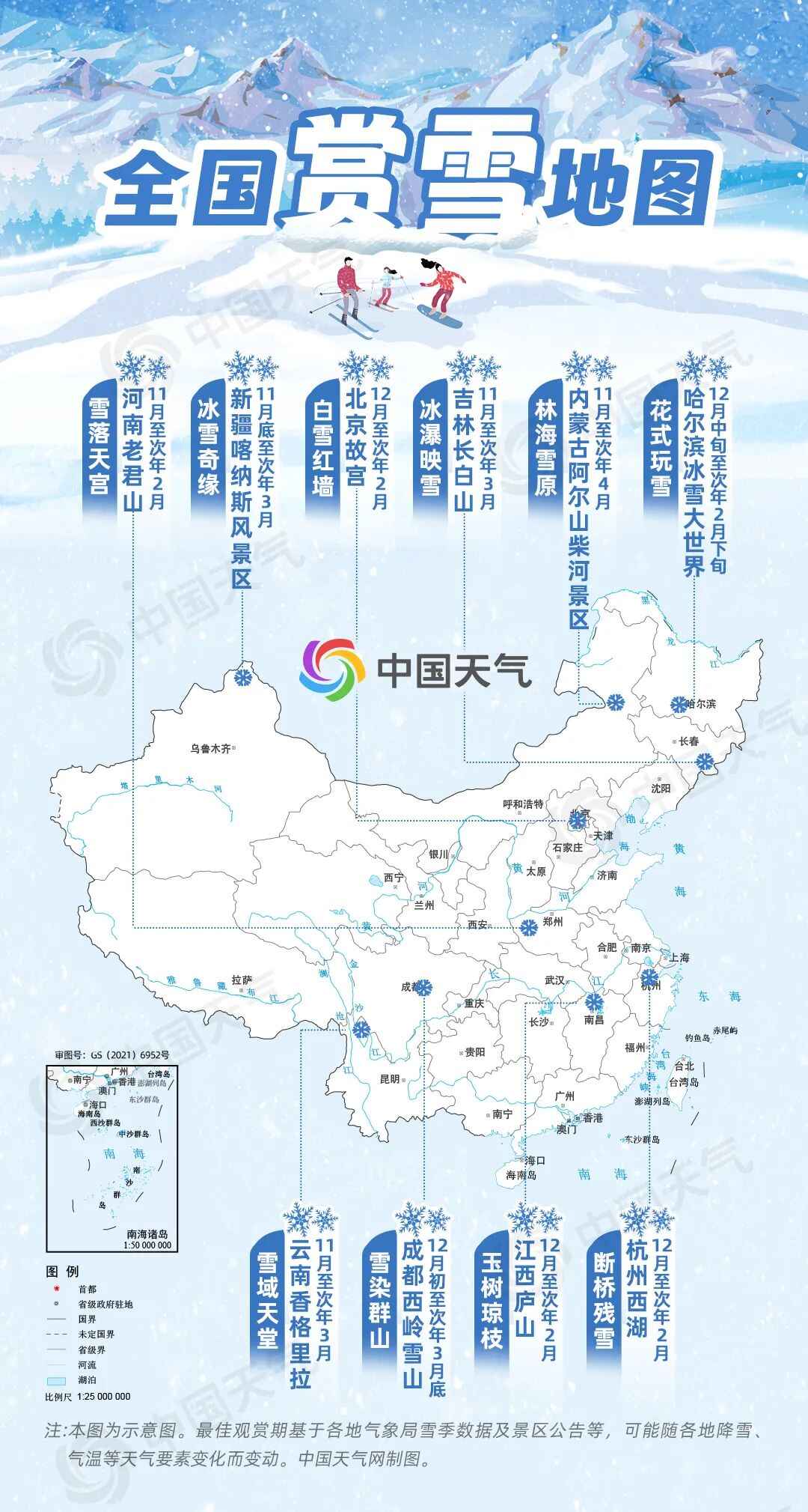 从中国天气网推出的全国赏雪地图来看,我国大江南北皆有赏雪胜地,目前都已进入最佳观赏期。北方赏雪地大多雪季十分漫长,高海拔地区最早8月就可飘雪,南方大部想要欣赏到雪景则要等到11月之后。
