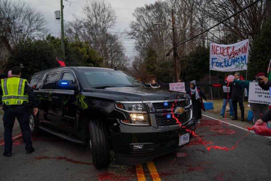 报道称,当布林肯离家时,示威者高喊着“你真可耻”的口号,并在道路和布林肯的车上洒了假血。抗议者还高呼“停止加沙地带的伤亡”和“战争罪犯”等口号。