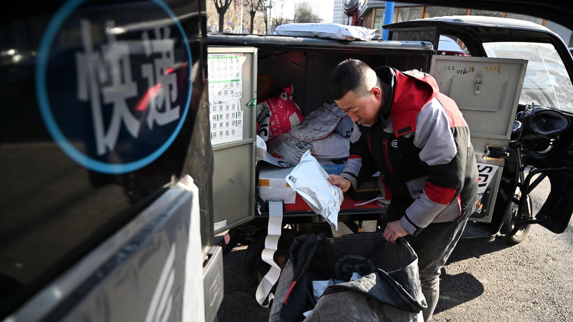 2024年1月3日,呼和浩特,快递工作人员分拣快件。