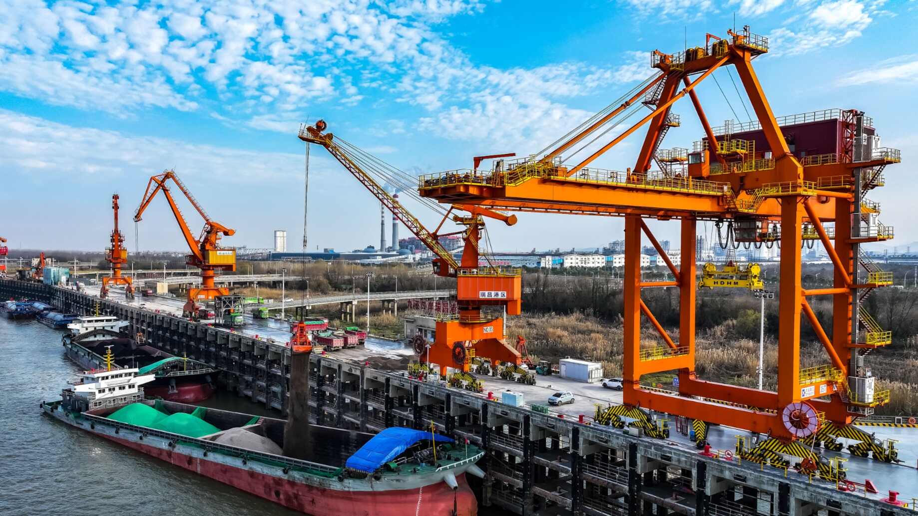 2024年1月4日,江西九江港,瑞昌港区公用码头,船舶和车辆正在进行装卸作业,现场一片繁忙。