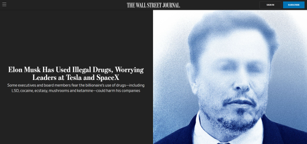 《华尔街日报》称,据目睹马斯克吸毒的人和其他知情人士的说法,马斯克经常在世界各地的私人聚会上吸食可卡因、摇头丸等药物,参加者要签署保密协议或交出手机才能入场。报道称,马斯克此前曾在公开场合吸食大麻。