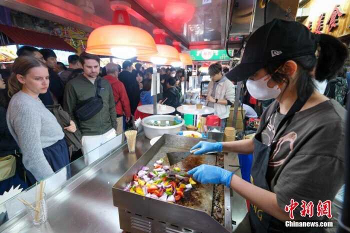 庙街夜市的美食摊档,吸引旅客光顾。中新网记者 陈永诺 摄