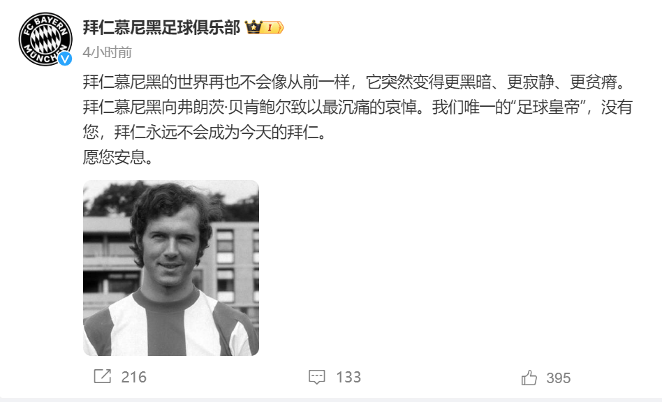 德国总理朔尔茨在社交媒体发文表示,贝肯鲍尔是德国最伟大的足球运动员之一,也是许多人心目中的“足球皇帝”——这也是因为他激发了几代人对于德国足球的热情。“我们将怀念他。”