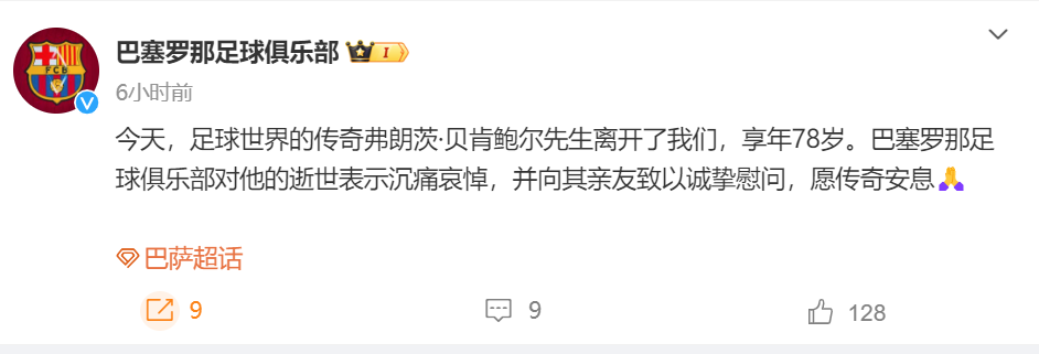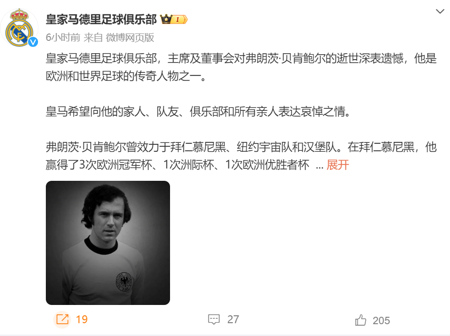 拜仁官方微博已将头像更换为黑白色,以纪念这位伟大的传奇,并发文称:“没有您,拜仁永远不会成为今天的拜仁。此外,皇家马德里、巴塞罗那等俱乐部官方微博也发文悼念。”