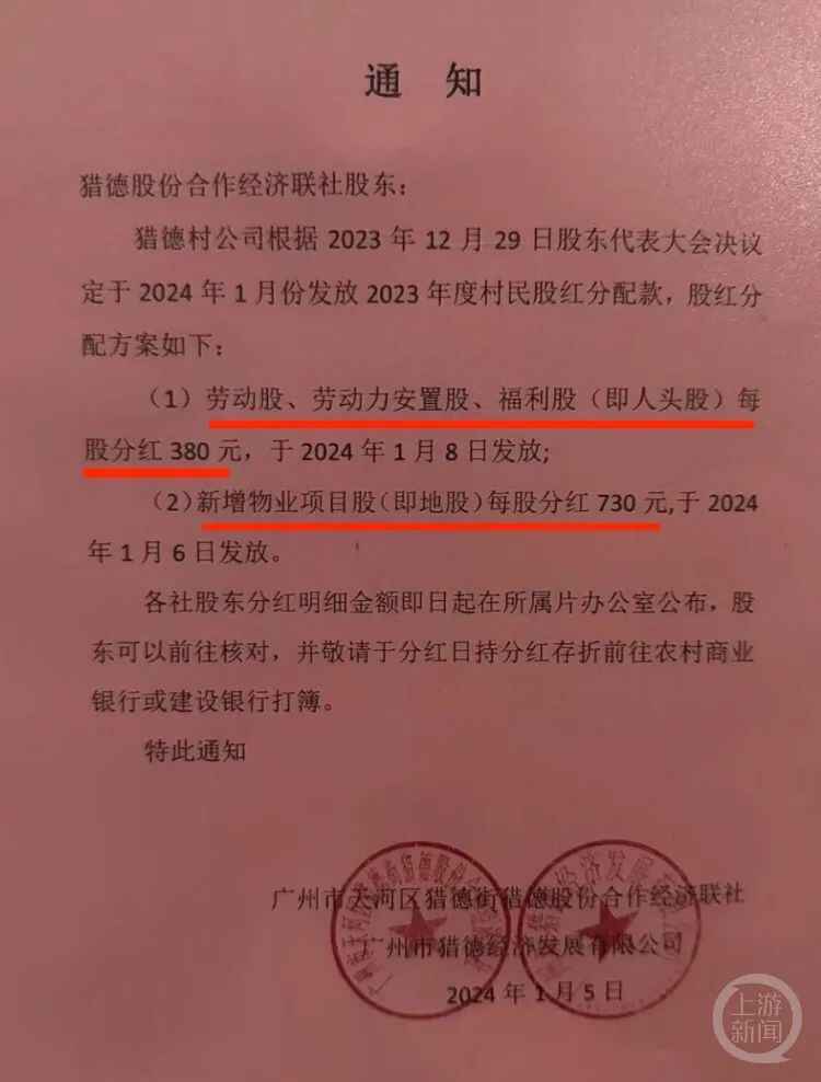 相关方案称,经济联社发放2023年度村民股红分配款,股红分配方案如下:(1)劳动股、劳动力安置股、福利股(即人头股)每股分红380元,于2024年1月8日发放;(2)新增物业项目股(即地股)每股分红730元,于2024年1月6日发放。
