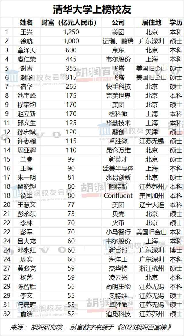 而在清华大学上榜校友的名单中,可以看到,章泽天以600亿的身家在清华优秀校友中排行第三,这引起了网友热议。对此,1月9日,胡润百富微信公号在“校友会榜发布”一文下留言称: “文中的财富数字来源于《2023胡润百富榜》,若百富榜上是以家族或夫妇名义上榜,则该财富数字为家族或夫妇财富,例如清华校友章泽天,600亿元财富为刘强东、章泽天夫妇的财富。”