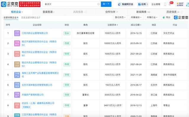 企查查APP显示,章泽天关联9家公司,8家为存续状态,多担任股东、董事长等职务,行业涉及文化艺术、资本市场服务等。值得关注的是,章泽天3家公司与刘强东存在商业关联,其中宿迁天强股权投资合伙企业(有限合伙)注册资本达1亿元,刘强东、章泽天分别持股89.01%、9.99%。