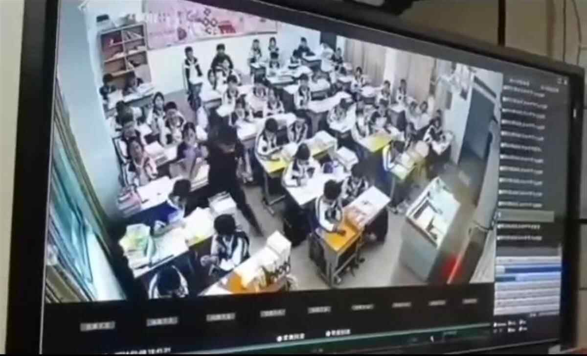 网传监控视频显示,教室里坐满了学生,一老师站在学生的座位前操作着手机,突然老师薅着学生的头发将其放倒,然后又强行拽手臂,把学生从座位上拖出来。