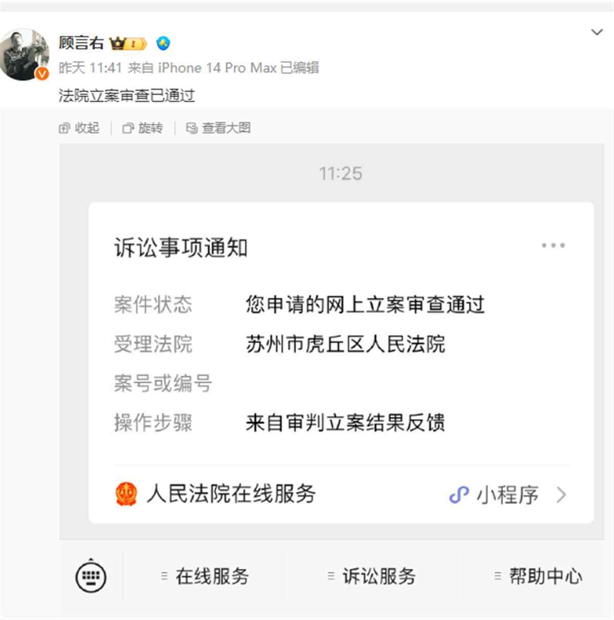 顾言右称,目前,他已收到立案审查通过的通知,接下来将把纸质材料寄给法院,等待开庭时间,“本来找好了一位律师,因为某些因素,他无法代理这个案子了,接下来我也不打算找律师了。”
