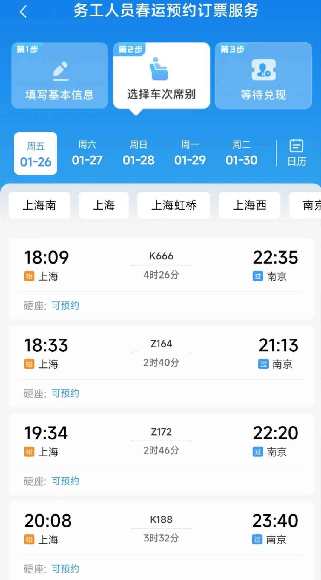 记者在铁路12306手机客户端中点击“务工人员春运预约订票服务”发现,系统中显示的“务工人员可预约车次”以K字开头的快速旅客列车、Z字开头的直达特快旅客列车和T字开头的特快旅客列车为主,席别大多为硬座。
