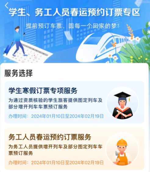 据中国铁路消息,自1月10日零时起,铁路12306手机客户端推出春运期间学生、务工人员专区预约购票功能,符合条件的旅客朋友可通过12306手机客户端专区预约购买春运期间往返火车票。